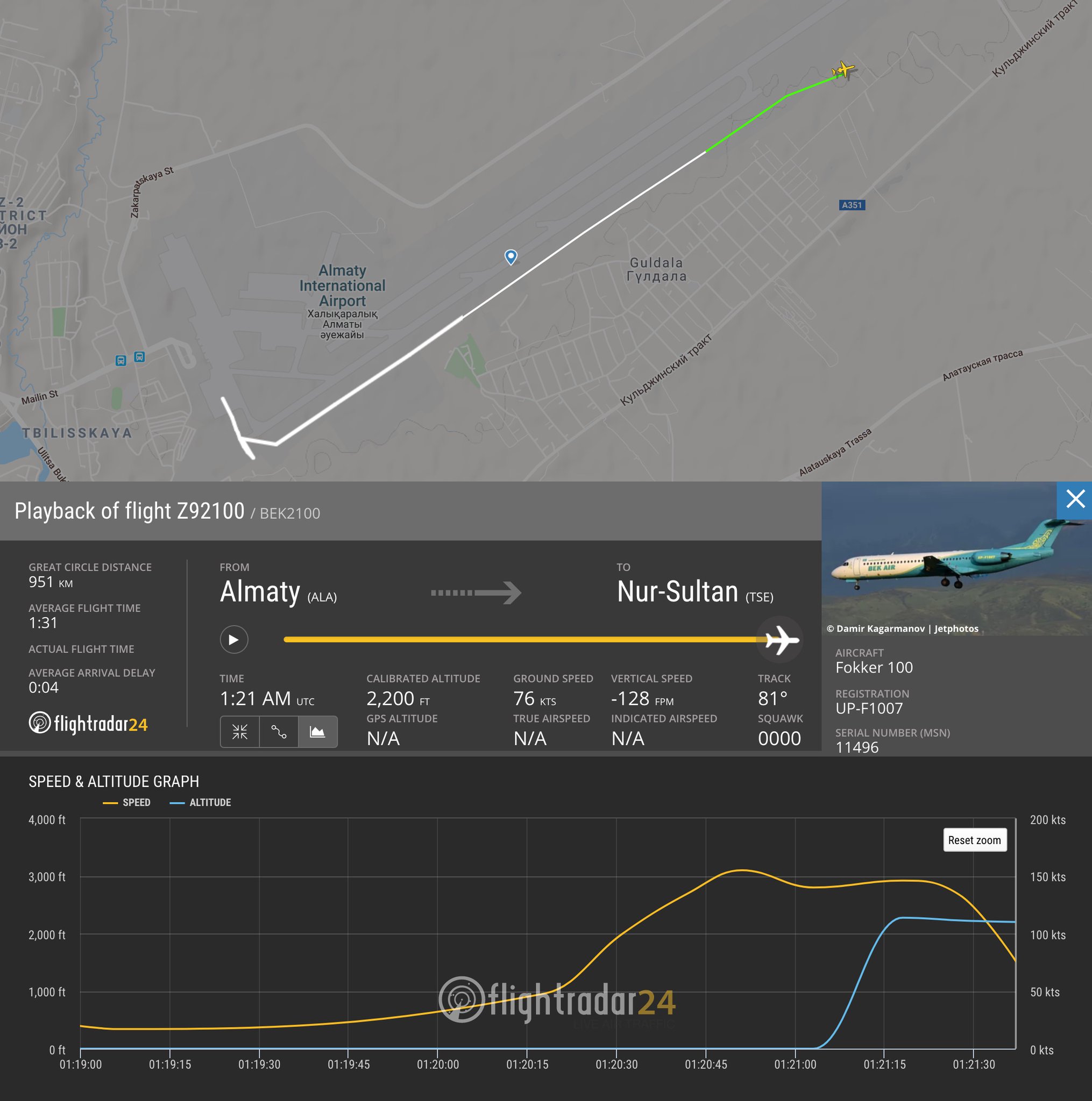 Based in the airport at Oral, Bek Air flies to the 12 largest cities in Kazakhstan, including Nur-Sultan, Almaty, Shymkent and Pavlodar. The company’s last reported incident – an emergency landing at Taraz airport – occurred on 20 February 2018, with no injuries. Yet Bek Air is also the owner of the oldest fleet in Kazakhstan: seven Fokker 100 planes with up to 108 seats. According to enquiries made by Informburo, all of the company’s Fokker 100 aircraft were built before 1995.