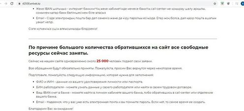Later events, however, showed that even the 42,500 tenge allowance was not so easy to obtain. First of all, due to the surge in visitors, Kazakhstan’s electronic government website for benefit claims, egov.kz, crashed (Editor’s note: on repeated occasions during the translation of this article, we have attempted to check information on egov.kz but not been able to access the site). Claimants flocked to the country’s citizens’ service centres, showing little concern for social distancing or any other COVID-19 preventive measures. Seeing that the situation was getting out of hand, state officials rushed to set up a new site 42500.enbek.kz in order to relieve the pressure. But this system too failed to cope with the traffic. The government then promised to launch a Telegram bot.