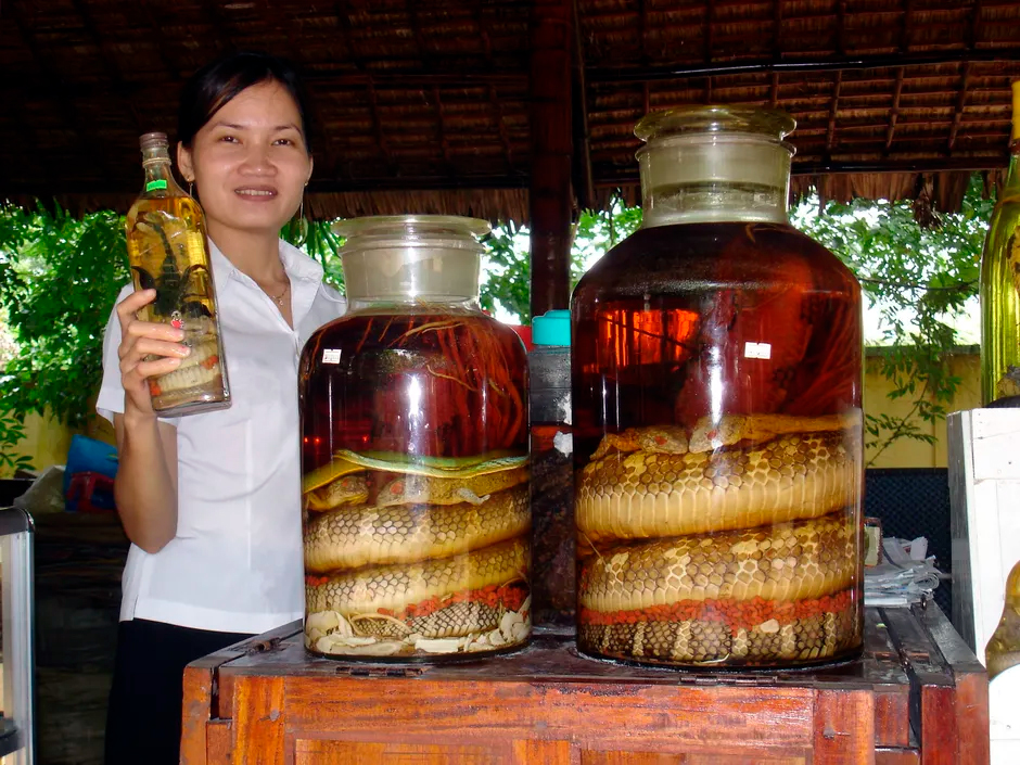 Interestingly, in China, both wine and vodka are infused not only with small poisonous snakes but also with large adult pythons. Of course, they aren’t placed in regular bottles, but in gigantic glass containers, sometimes as large as a human.