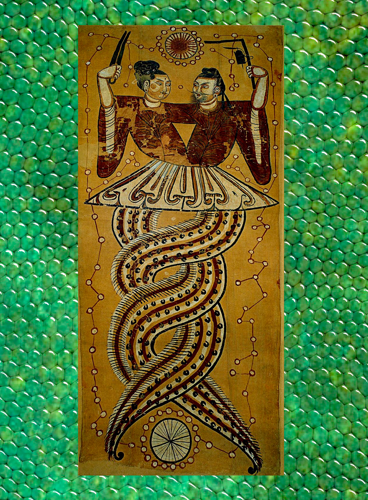 This may reflect even older cults linked to Chinese mythology. The legendary ancestors of the Chinese people, Nuwa and Fu Hsi, are often depicted as half-human, half-snake figures. Their bodies and heads are typically human (sometimes bovine), but their lower halves are serpentine. In Han dynasty tombs, there are reliefs showing Nuwa and Fu Hsi intertwined with their serpentine tails. Fu Hsi, as the male figure embodying the yang principle, holds the sun, while Nuwa holds the moon.