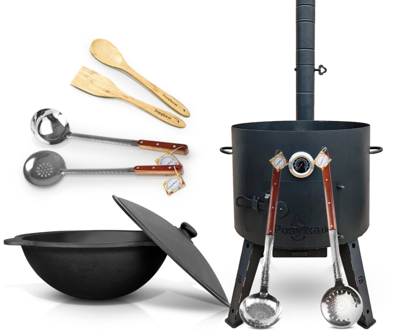 — Of course. On Posylka.de, for example, a full set costs €292. It includes a stove, a kazan pot, a spoon, a spatula, a thermometer, a skimmer, and a ladle. If you buy just the stove and kazan separately, they already cost around €290, so buying the full set saves you about 20%.