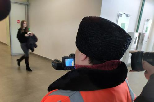 A Rospotrebnadzor employee with a thermal imaging camera at a Russian airport. Still image from TV channel NTV