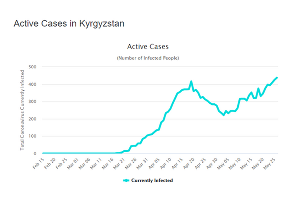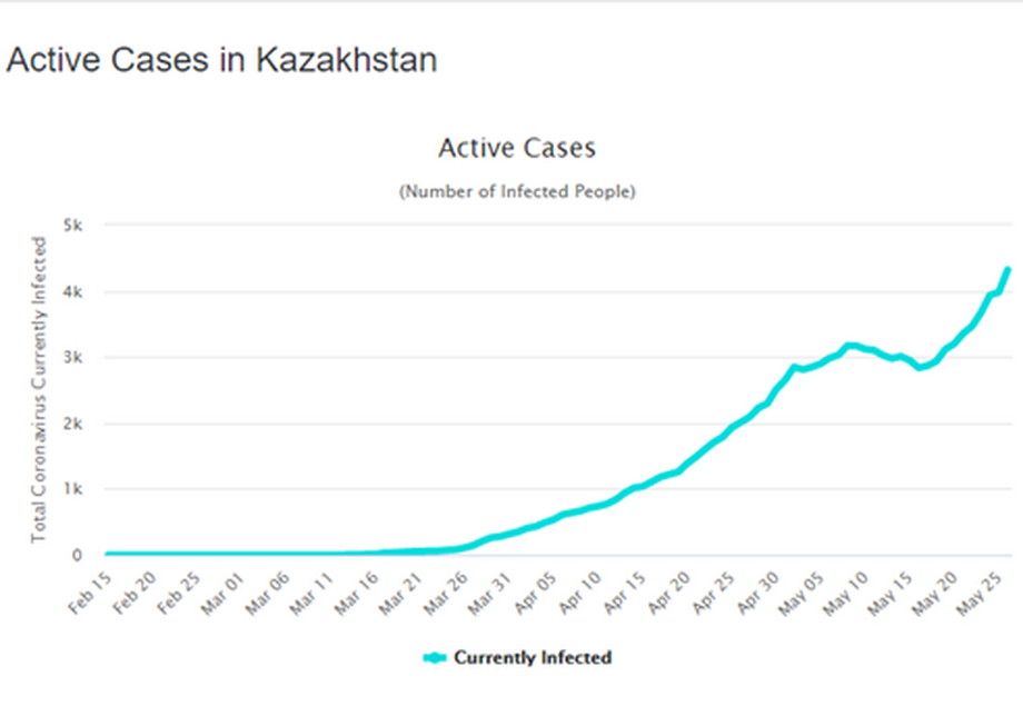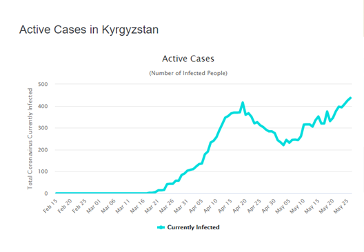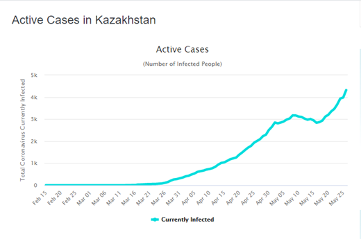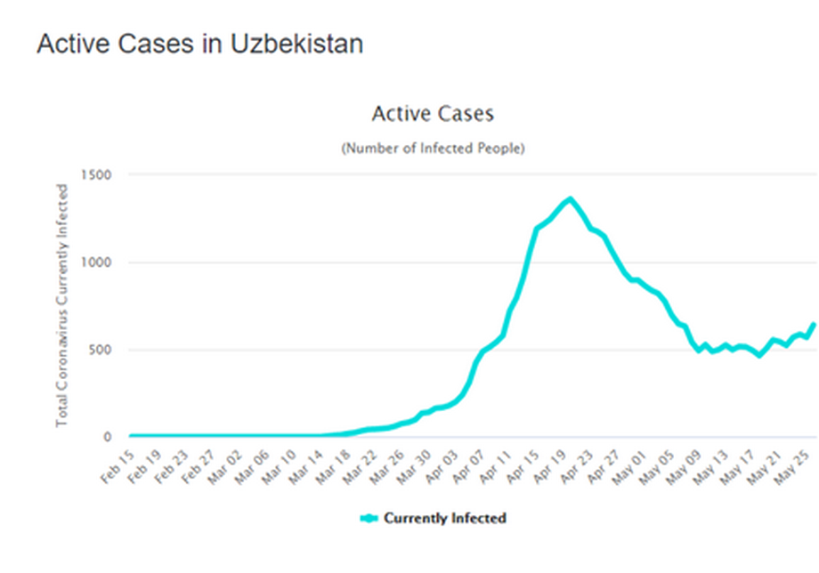 After seeing a steep drop in the number of (officially-registered) active cases between 20 April and 9 May, numbers of new infections have risen again in Uzbekistan over the last two weeks, at the same time as the government has moved to gradually reopen the economy – the rise has not, though, been as clear as in Kazakhstan and Kyrgyzstan.