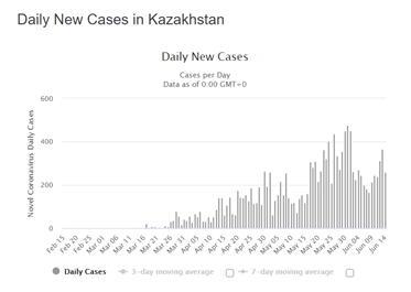 Daily new COVID-19 cases in Kazakhstan. Chart from worldometers.info/coronavirus