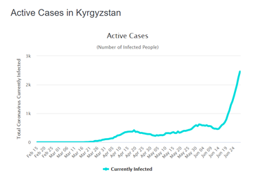 Graph showing active coronavirus cases in Kyrgyzstan . From worldometers.info/coronavirus