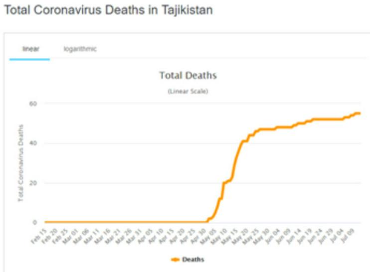 If the government's official statistics are anything to go by, Tajikistan has had a COVID-19 odyssey like that of few other countries. After declaring its first cases of the coronavirus on 30 April, the day before the arrival of the WHO mission, Tajikistan claims to have hit the peak of its epidemic only two weeks later, on 15 May. The country's death tally, too, shows an unusually precipitous rise in the first half of May, when 41 of its 55 official COVID-19 fatalities to date are recorded as occurring, followed by an almost horizontal line in the two months that have passed since then.