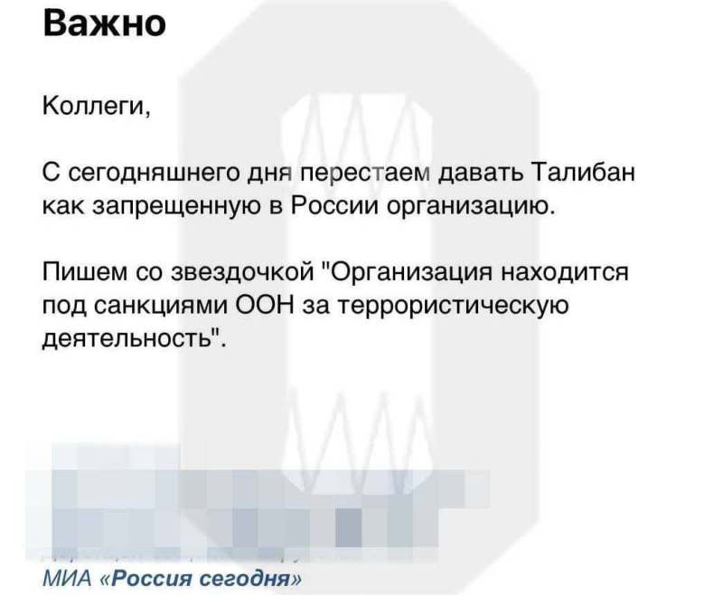 The international news agency Rossiya Segodnya sometimes referred to as ‘Russia Today’ (RIA Novosti, Sputnik — owned and operated by the Russian government), suddenly discontinued labeling the Taliban * an organization banned in the Russian Federation as required by law. On November 8, an internal memo from RT division heads with the corresponding directive was sent to all news agencies personnel, reports the Telegram channel Ostorozhno Novosti. The channel also shared a sent memo’s copy.