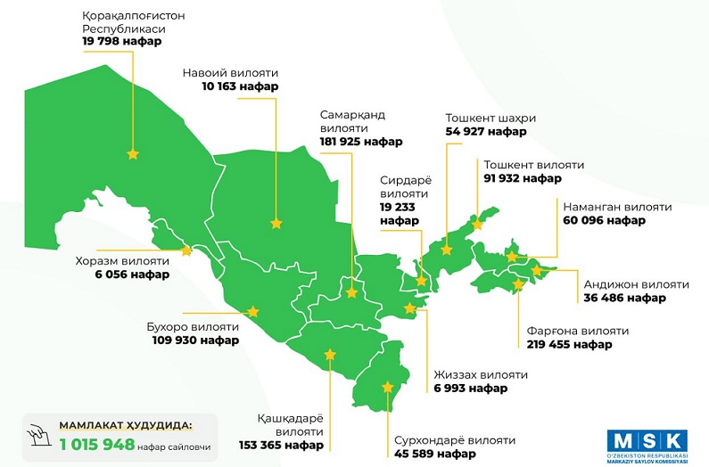 According to statistics shared on the Central Election Commission's (CEC) Telegram channel, 1,015,948 citizens have cast their ballots during early voting for Uzbekistan's Legislative Chamber of Oliy Majlis (lower house of parliament) and local government elections.