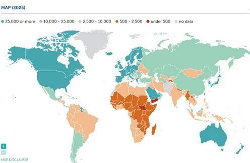 In Central Asia, Kazakhstan currently ranks first. Turkmenistan is second ($13,340), followed by Uzbekistan ($3,510), Kyrgyzstan ($2,750), and Tajikistan ($1,430).