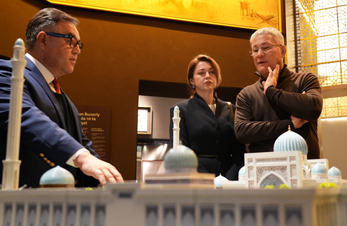 The delegation toured the Center, viewing rare archaeological finds, digitized manuscripts, and AI-based exhibitions in the museum’s sections — “Pre-Islamic Period,” “First Renaissance,” “Second Renaissance,” “New Uzbekistan: Foundation of the New Renaissance,” as well as the Hall of the Holy Quran.