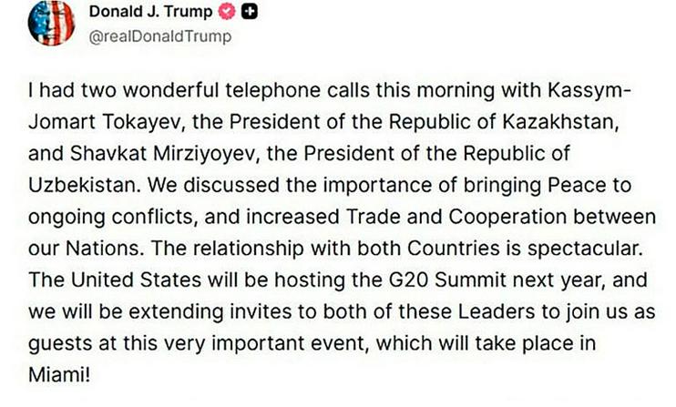 “This morning I had two wonderful phone calls with Kassym-Jomart Tokayev, President of the Republic of Kazakhstan, and Shavkat Mirziyoyev, President of the Republic of Uzbekistan. We discussed the importance of establishing peace in current conflicts, as well as expanding trade and cooperation between our countries. Relations with both countries are excellent. Next year, the United States will host the G20 Summit, and we will be sending invitations to both leaders to join us as guests at this very important event, which will take place in Miami!” Trump wrote.