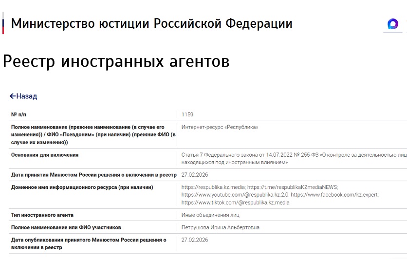 In its justification, the Russian Justice Ministry stated that Respublika.kz.media had disseminated materials produced by foreign agents and organizations designated as “undesirable” in Russia, as well as what it described as “false information” about decisions taken by Russian authorities. The ministry also claimed that the project was created with the support of a foreign organization and is managed from outside Russia.