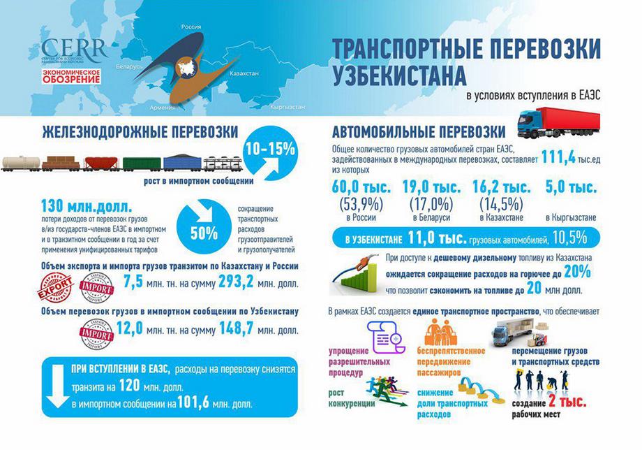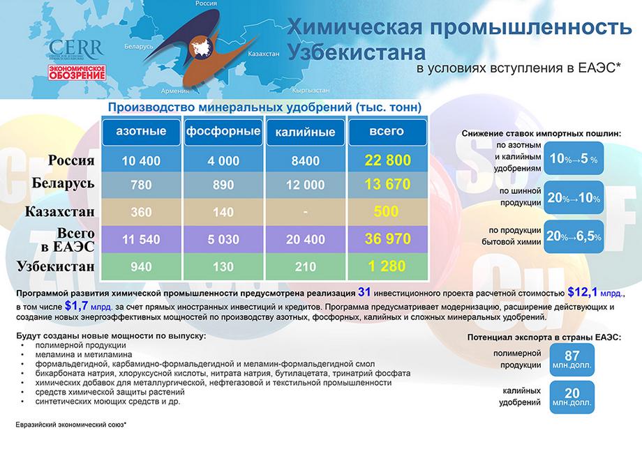 The report’s conclusions were backed up by infographics prepared by the CERR on various sectors of the Uzbek economy. Not all sectors of the economy were represented in the charts. The Uzbek automobile industry, for instance, is hardly likely to be overjoyed at the prospect of joining the EAEU. The single customs union could wipe out UzAuto Motors’ monopoly over the domestic market, established by the country’s government at the time of the company’s creation and supported by the state ever since. It cannot be ruled out that some sectors of the economy will enter into decline following the integration, as was the case with poultry farming and cement production in Kyrgyzstan, which were unable to withstand the competition from companies in other EAEU countries.